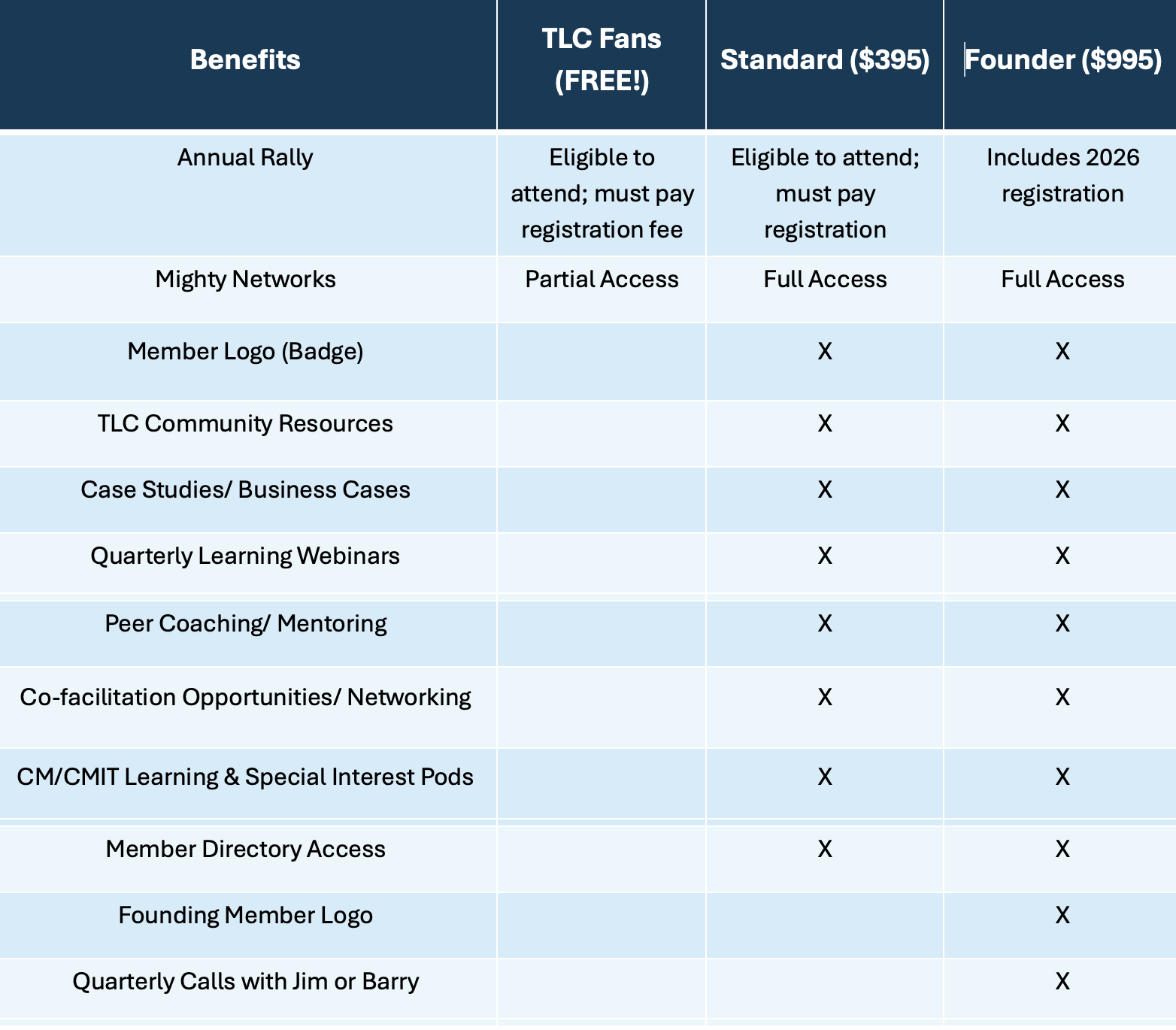 Yes, the TLC Rally (both in-person and virtual) is a separate event with its own expenses. However, the Founding Member fee does include one pass to attend the 2026 in-person Rally and there is an option to upgrade your Standard Members to include a 2026 in-person pass for $795. You do not need to be a member of the Alliance to attend the Rally. However we hope that attending the Rally will encourage membership in the TLC Alliance.